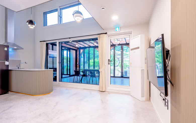 #_GREEN 객실 최대 5인까지 수용되는 널찍한 객실. 방 2개, 거실과 주방, 개별 바비큐장.